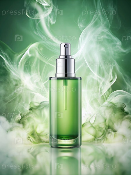 Зеленая косметическая жидкая бутылка с белым дымом на зеленом фоне Generating AI
