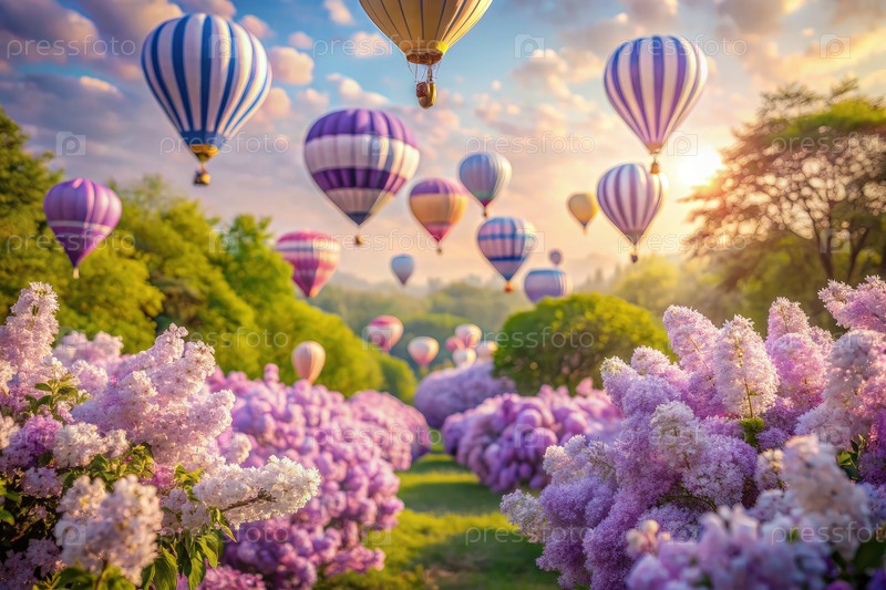 Красочные воздушные шары, парившие над лиловым садом на рассвете