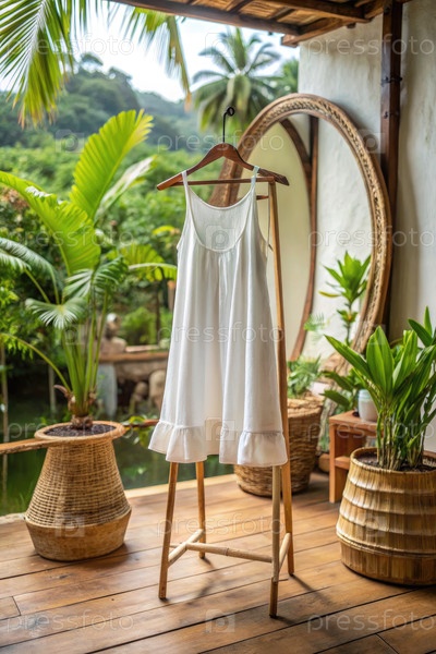 Белое хлопковое платье A-Line, висящее на деревянном стенде во дворе