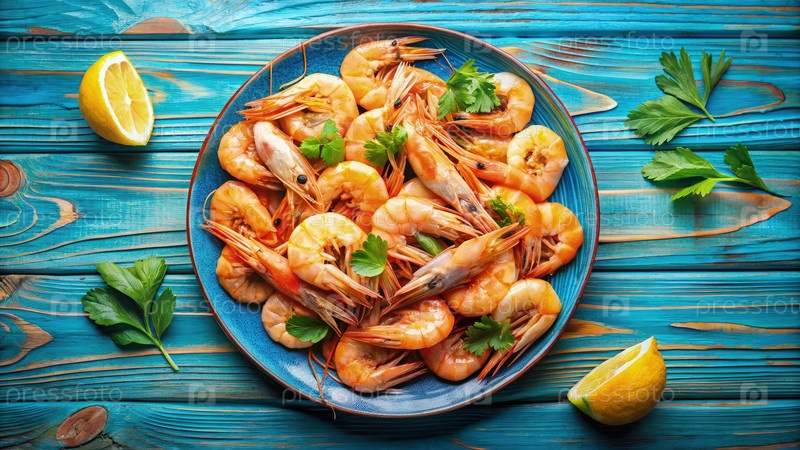 Тарелка с приготовленными креветками, лимоном и петрушкой