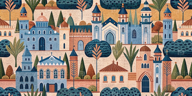 Городская живопись с деревьями и зданиями.Генерирование ИИ