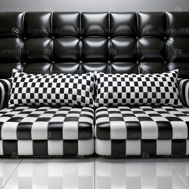 Черно-белый диван с чемоданами и подушками, генерирующий ИИ