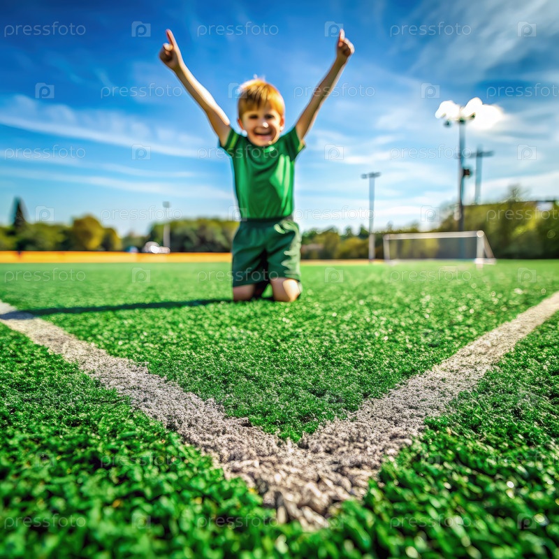 Маленький мальчик сидит на футбольном поле с поднятыми руками