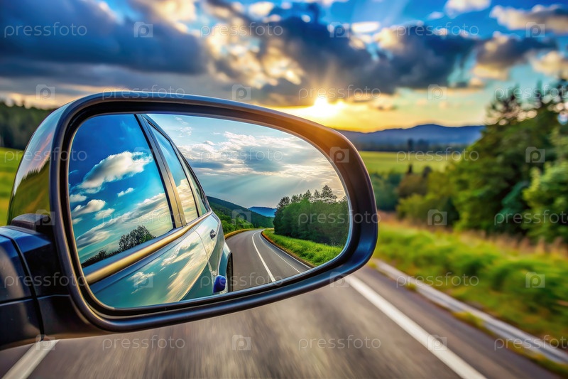 Зеркало заднего вида, отражающее живописный пейзаж