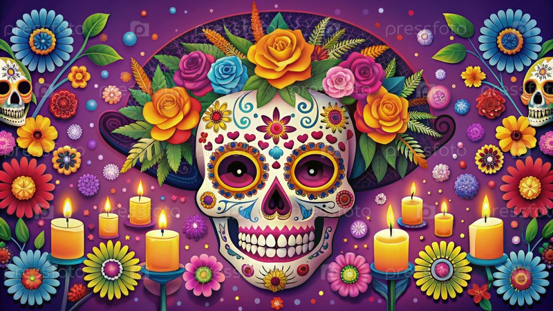 Череп с цветами и свечами, создание ИИ