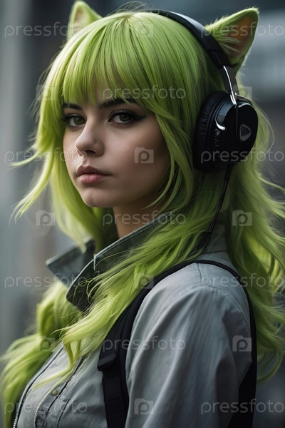 Женщина с зелеными волосами в наушниках Generating AI