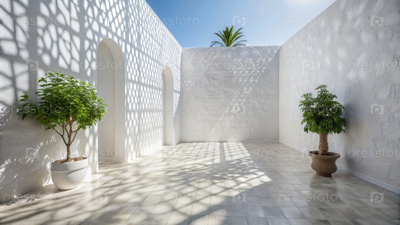 Белые стены и геометрические тени на освещенном солнцем дворе