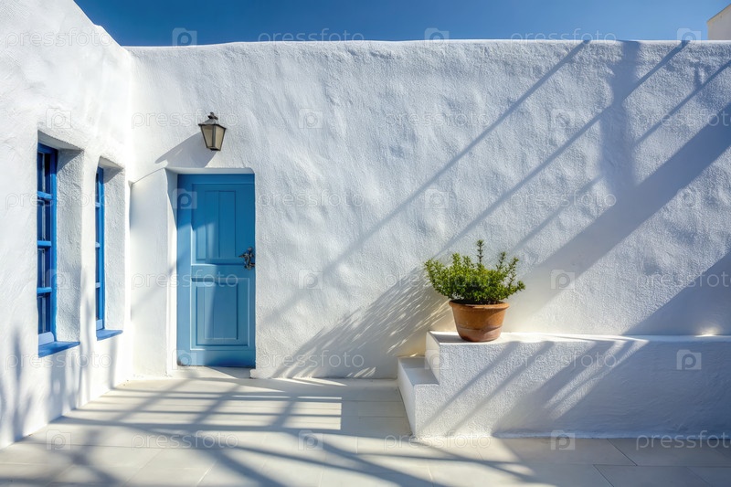 Побеленный греческий двор с синей дверью и горшковыми растениями