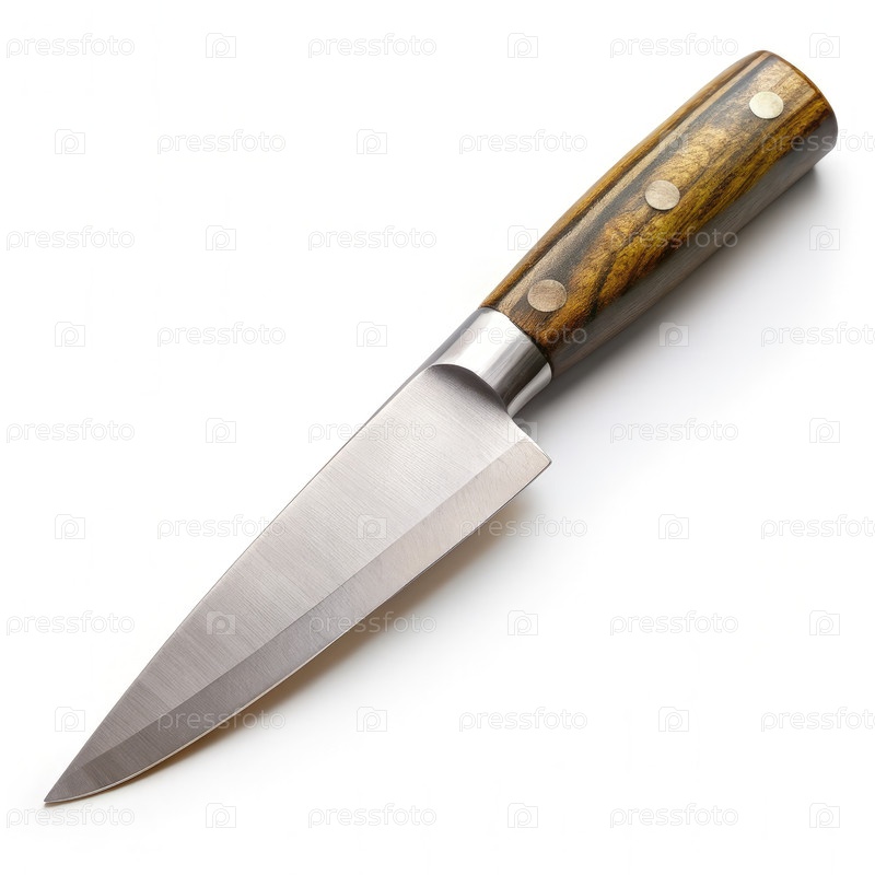 Острый кухонный нож с деревянной ручкой на белом фоне