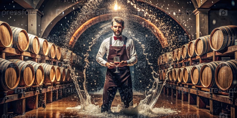 Сомелье стоит в винном погребе, вокруг которого брызгает вода