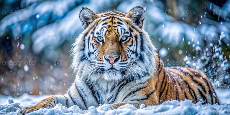 Величественный тигр, лежащий в снегу зимой