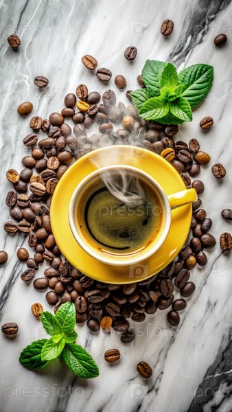 Чашка черного кофе, окруженная кофейными зернами и мятой на мраморной поверхности