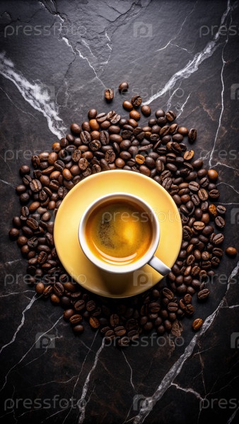 Вид чашки кофе в окружении кофейных зерен на мраморной поверхности
