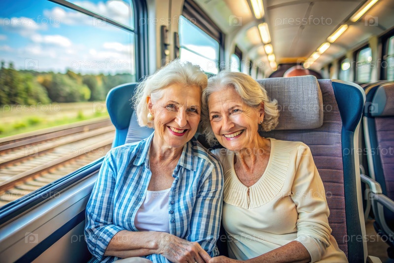 Счастливые пенсионеры путешествуют на поезде через живописный пейзаж