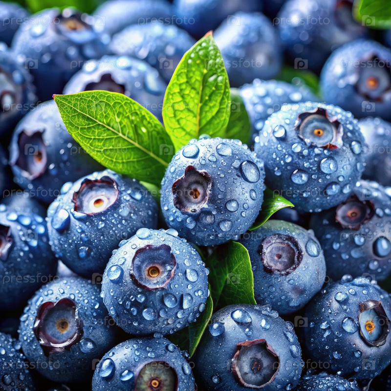 Закрытие свежих черники капельми росы и зелеными листьями. генерирование AI