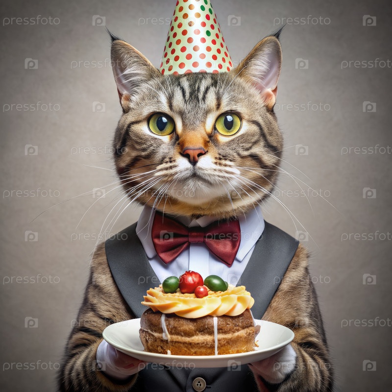 Праздничный кот в галстуке, держащий торт на день рождения