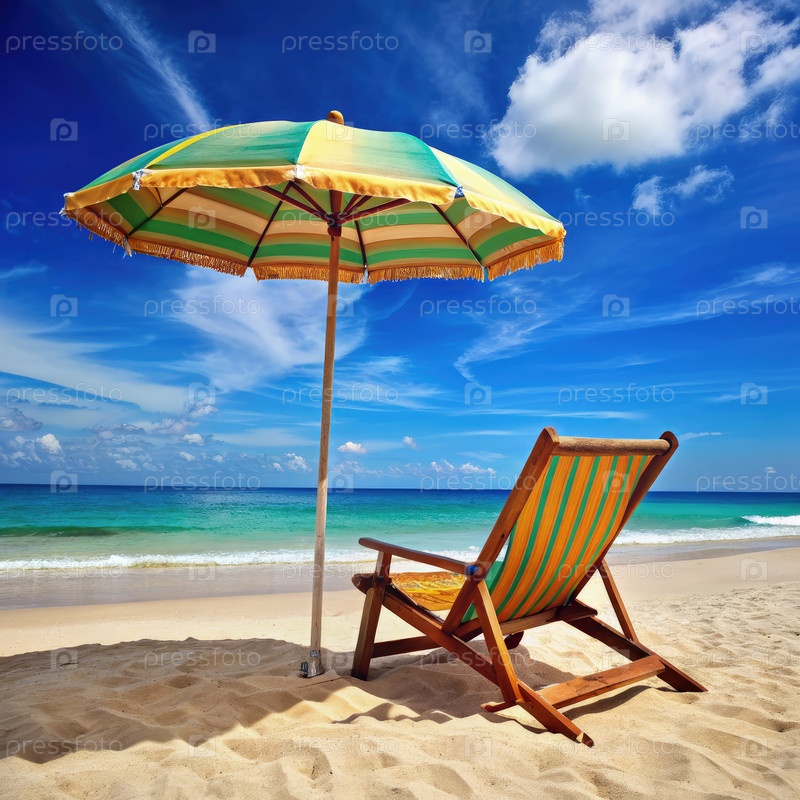 Расслабляющий пляжный стул под полосатым зонтиком в солнечный день