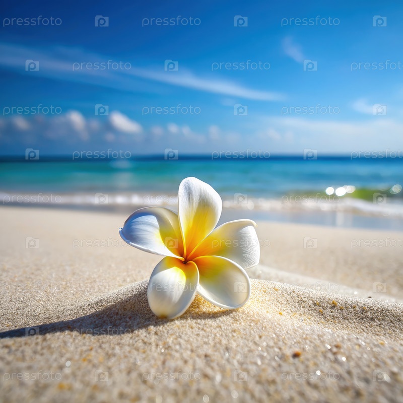 Белый цветок на песчаном пляже под голубым небом