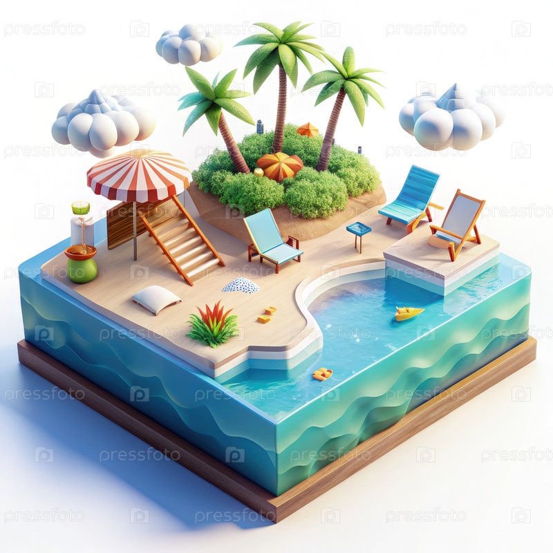 Изометрический пляжный остров с пальмами, бассейном и шезлонгами