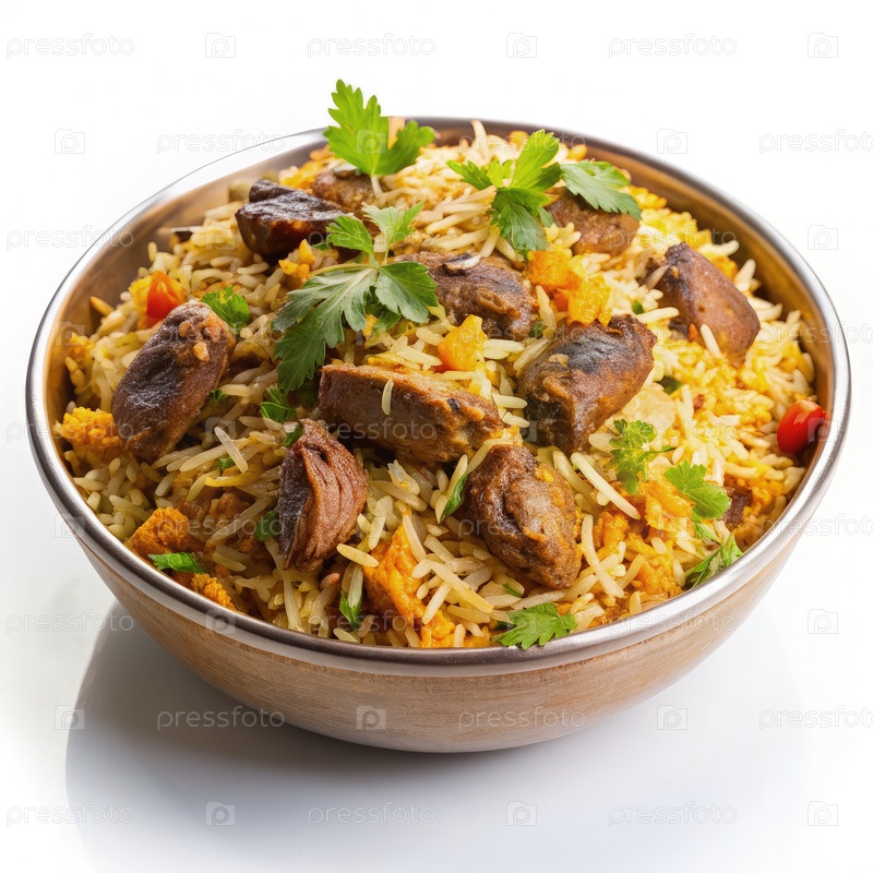 Вкусная говядина Бирджани в серебряной таре на белом фоне
