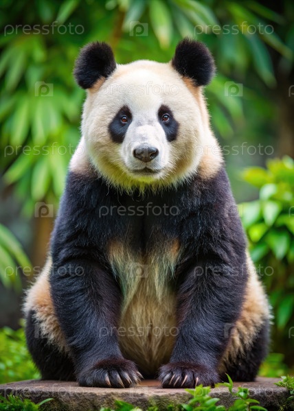 Гигантская панда спокойно сидит в пышном зеленом лесу