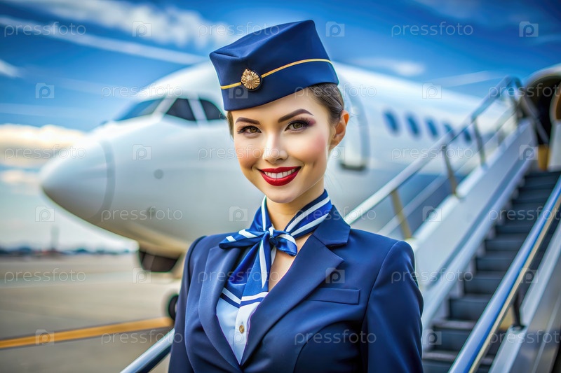 Стюардесса улыбается в аэропорту с самолетом на заднем плане