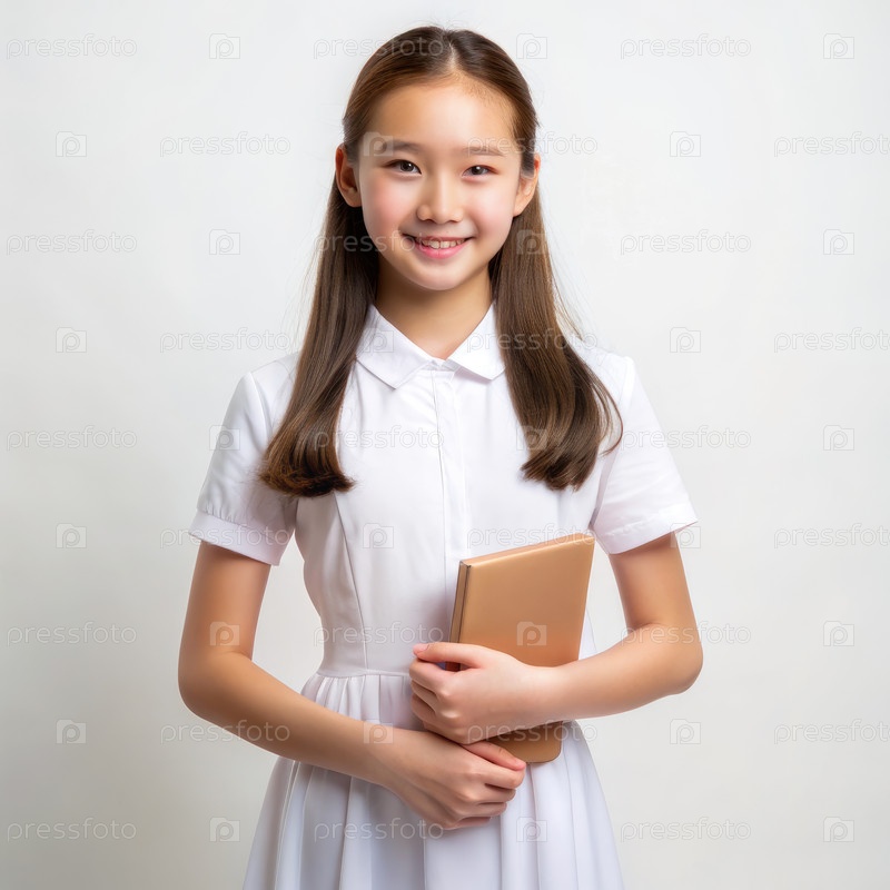 Улыбающаяся ученица держит учебник в белом платье на белом фоне