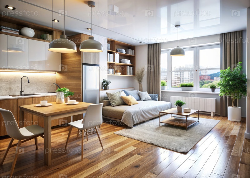 Дизайн интерьера квартиры-студии с кухней, жилыми и спальными помещениями. генерирование современного ИИ