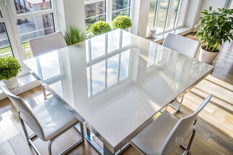 Яркая белая столешница с стульями и отражением окна