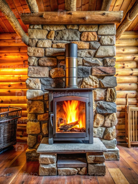 Печь для сжигания древесины в бревенчатом домике, генерирующая ИИ