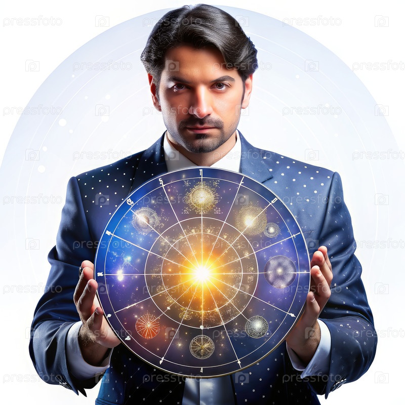 Человек в костюме, держащий колесо знака Зодиака