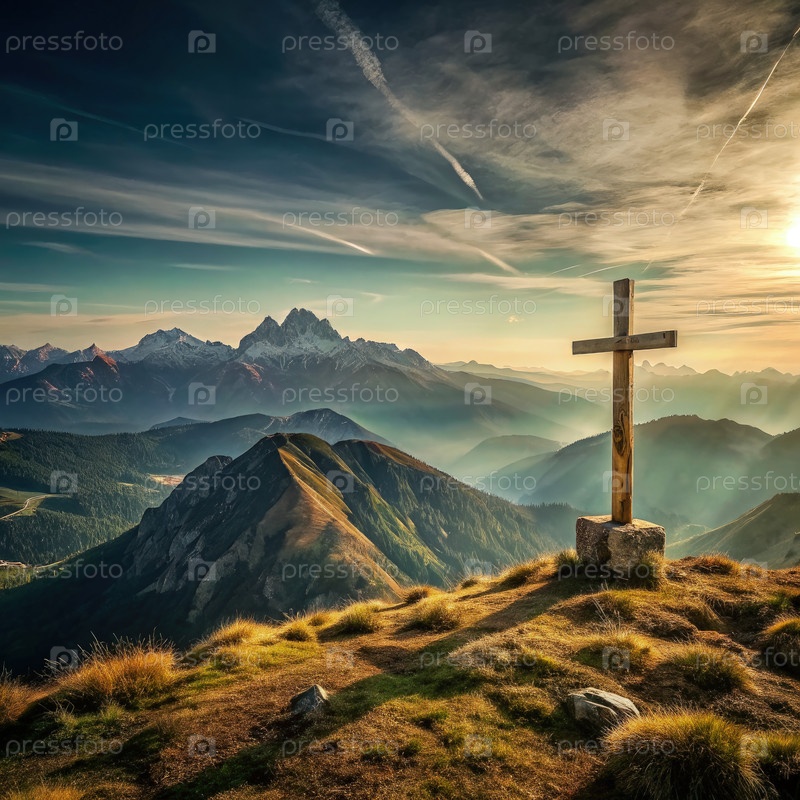 Крест, стоящий высоко на холме с горным фоном