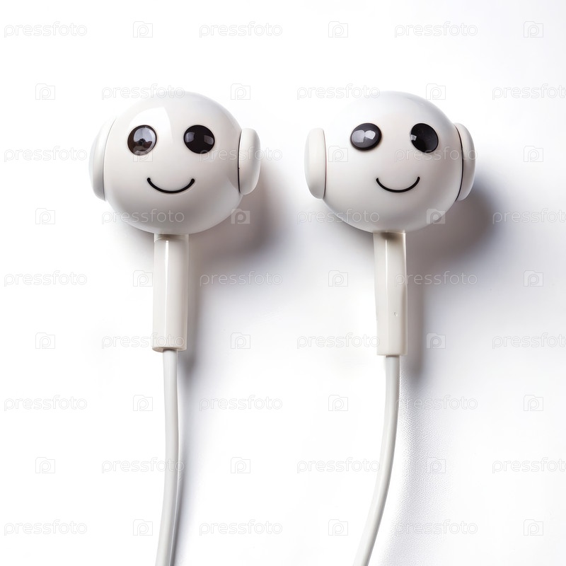 Белые наушники с улыбающимися лицами на белом фоне