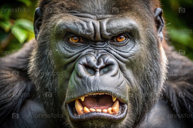 Закрытие лица сердитой гориллы в тропическом лесу. генерирование ИИ