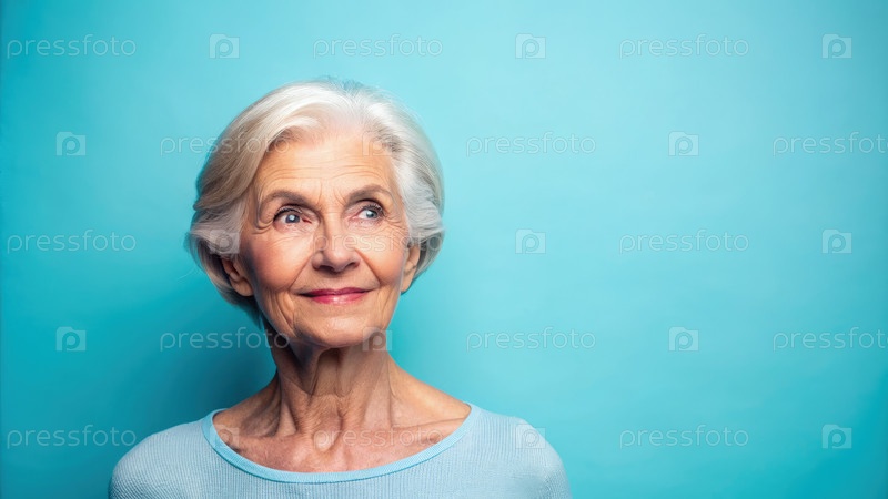 Улыбающаяся пожилая женщина смотрит на синий фон Генерация ИИ