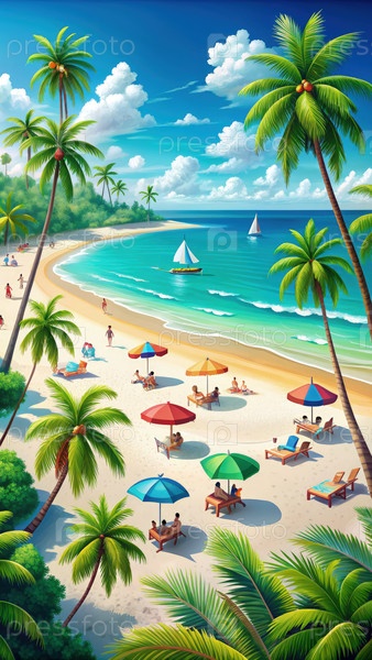 Летняя пляжная сцена с пальмами, зонтиками и парусными лодками
