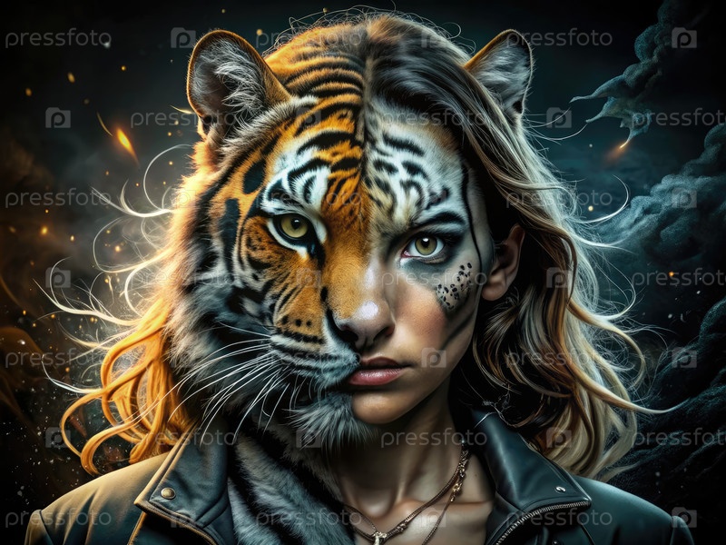 Женщина превратилась в тигра, наполовину человека, наполовину животного и пристально смотрела на камеру