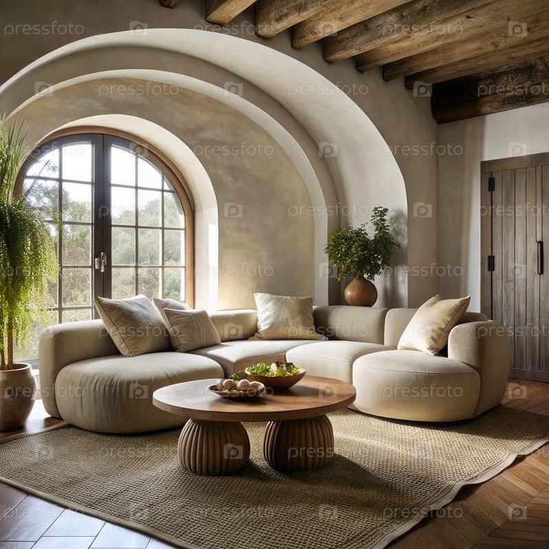 Минималистская бежевая гостиная с аркой и деревянными балками