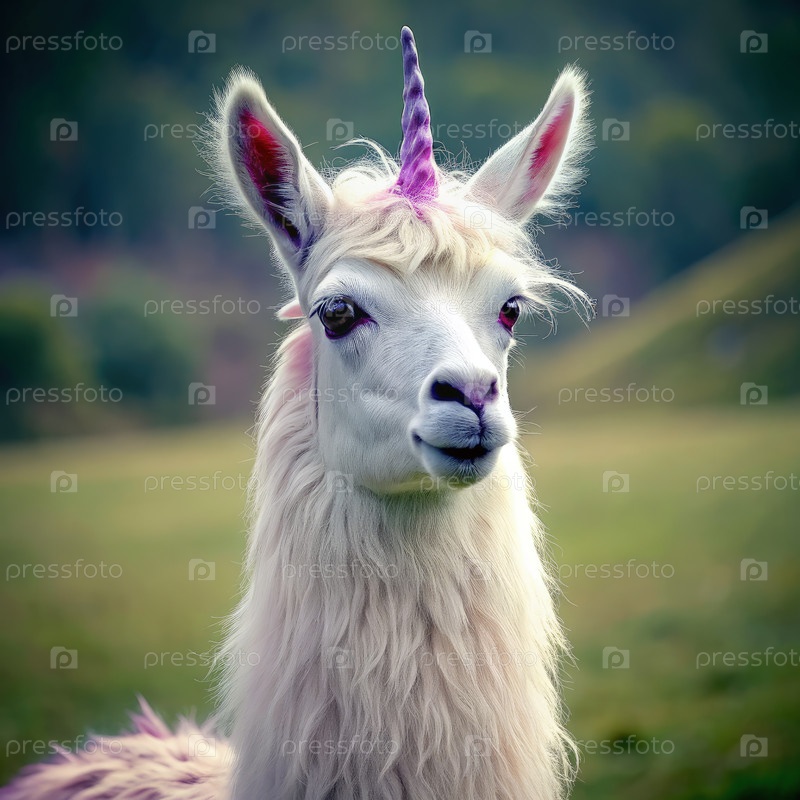 Белая лама с фиолетовым единорогом в поле