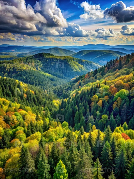 Вид с воздуха на пышный зеленый лес в горах в солнечный день
