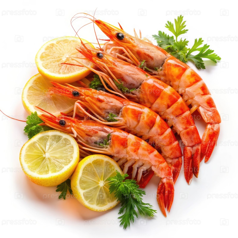 Четыре приготовленных креветок-тигров с лимонными клинками и петрушкой на белом фоне