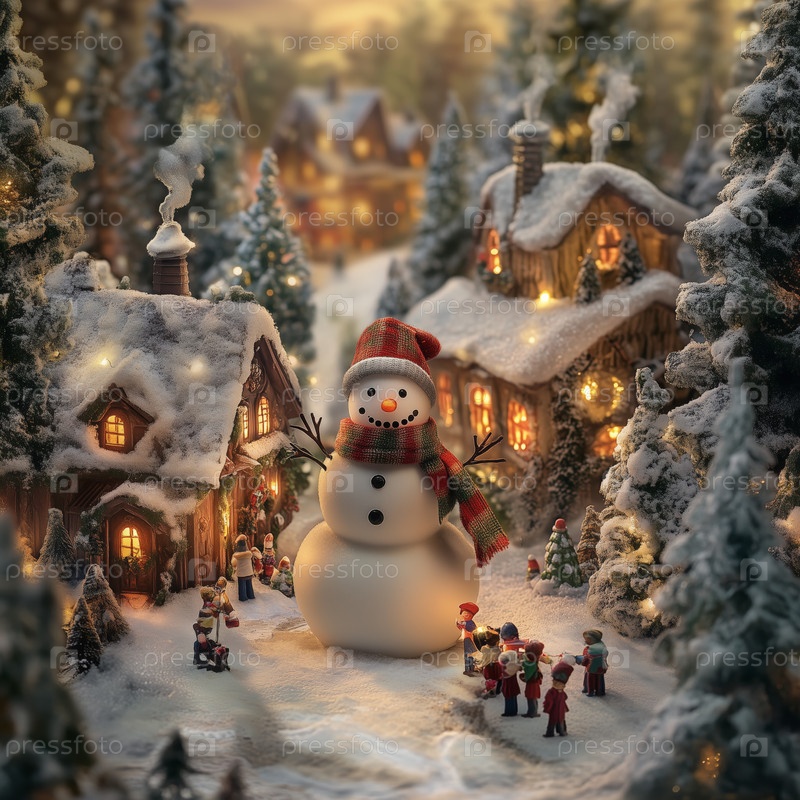 Снеговик и дети в заснеженной рождественской деревне