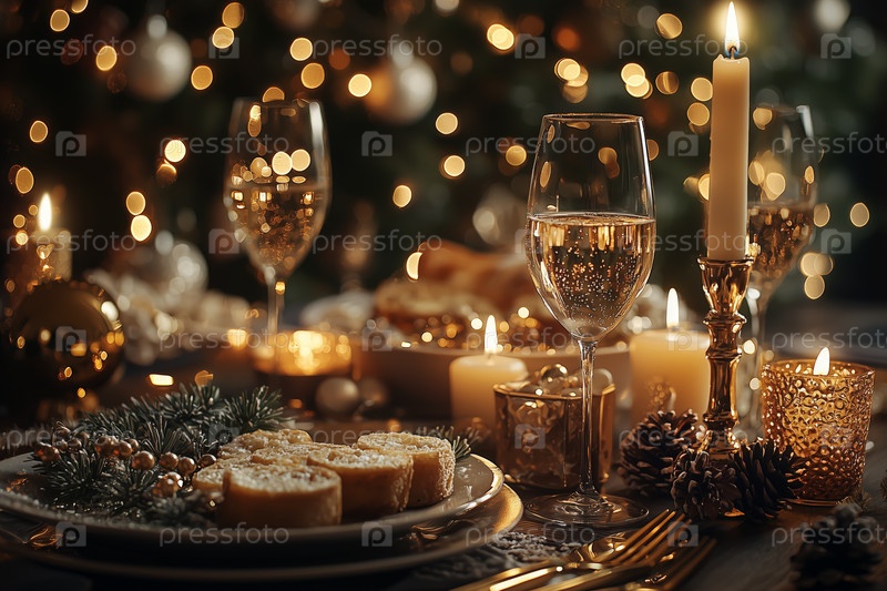 Элегантный праздничный стол со свечами и шампанским