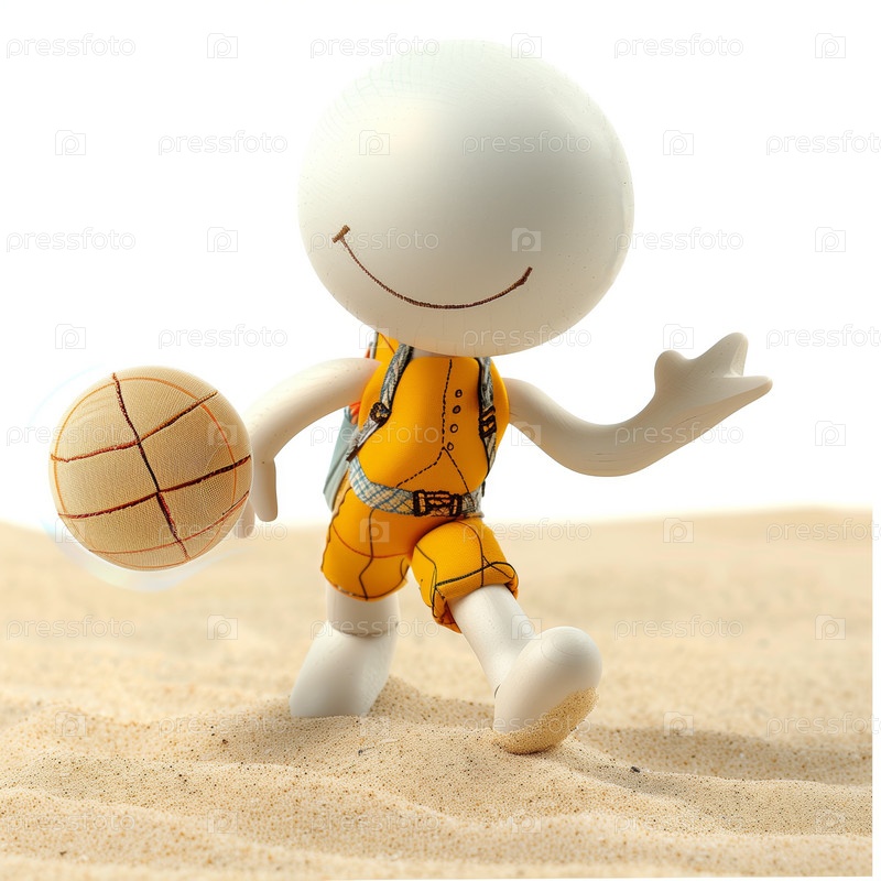 Стикмен играет с мячом в песке, изолированном на белом фоне