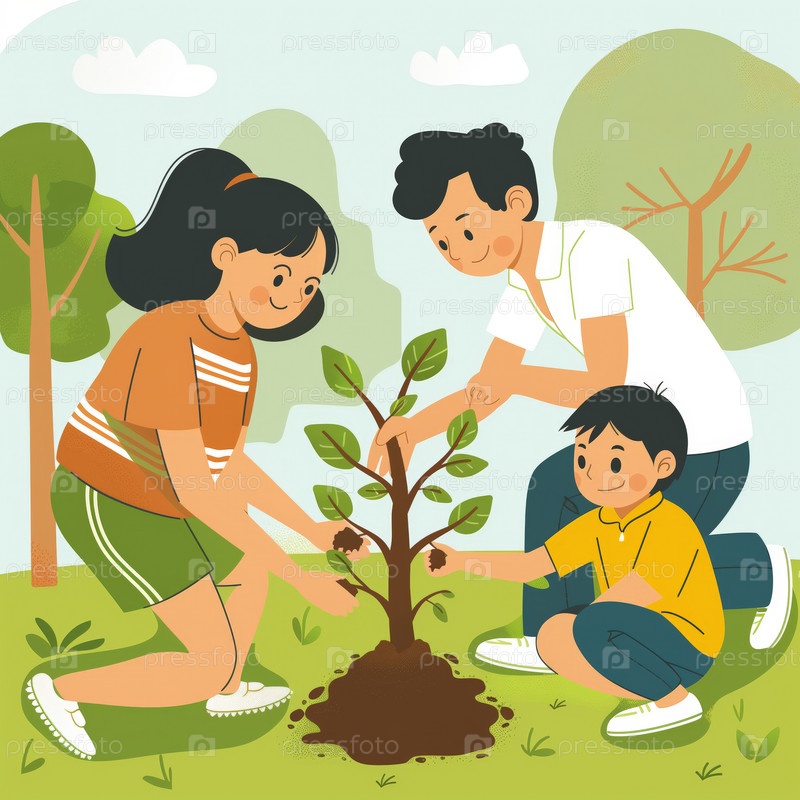 Семья сажает дерево вместе