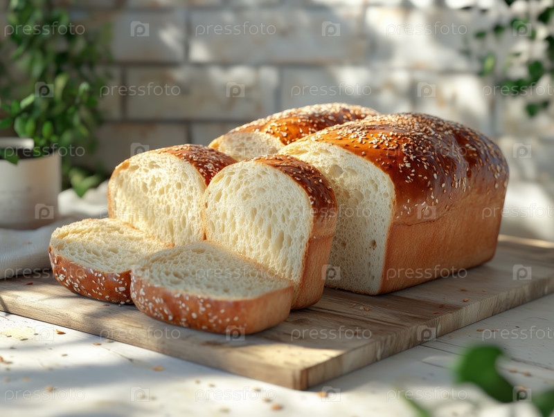 Свежерезанный кусок сусамового хлеба на деревянной доске с солнечным светом