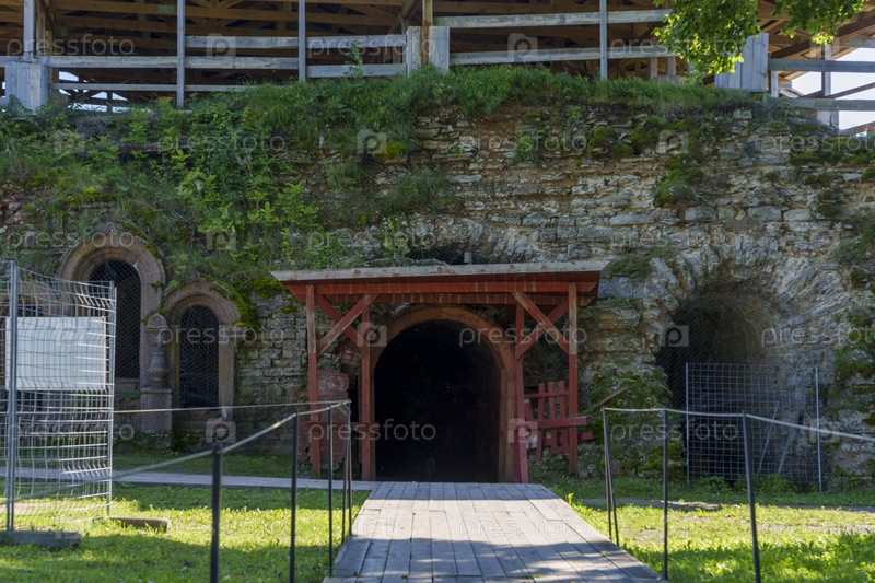 Исторический каменный вход в крепость с деревянной тропой и деревьями