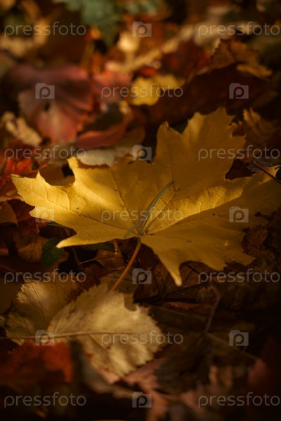 Желтый кленовый лист на постели осеннего листья