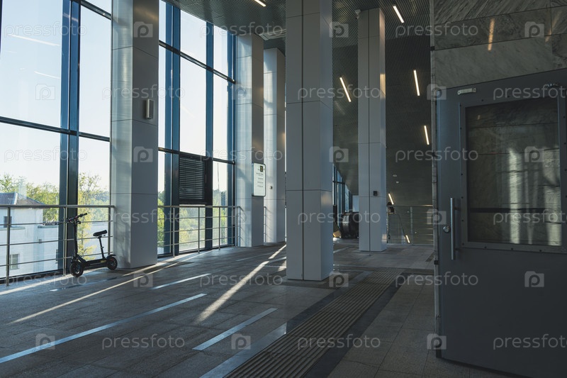 Просторный современный интерьер станции с солнечным светом и стеклянными стенами