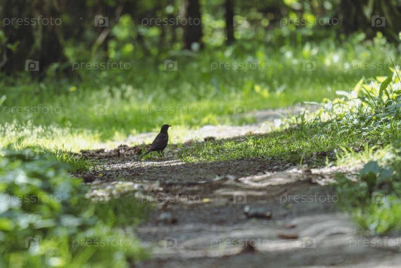 Черная птица, стоящая на лесной тропе под тусклым солнечным светом
